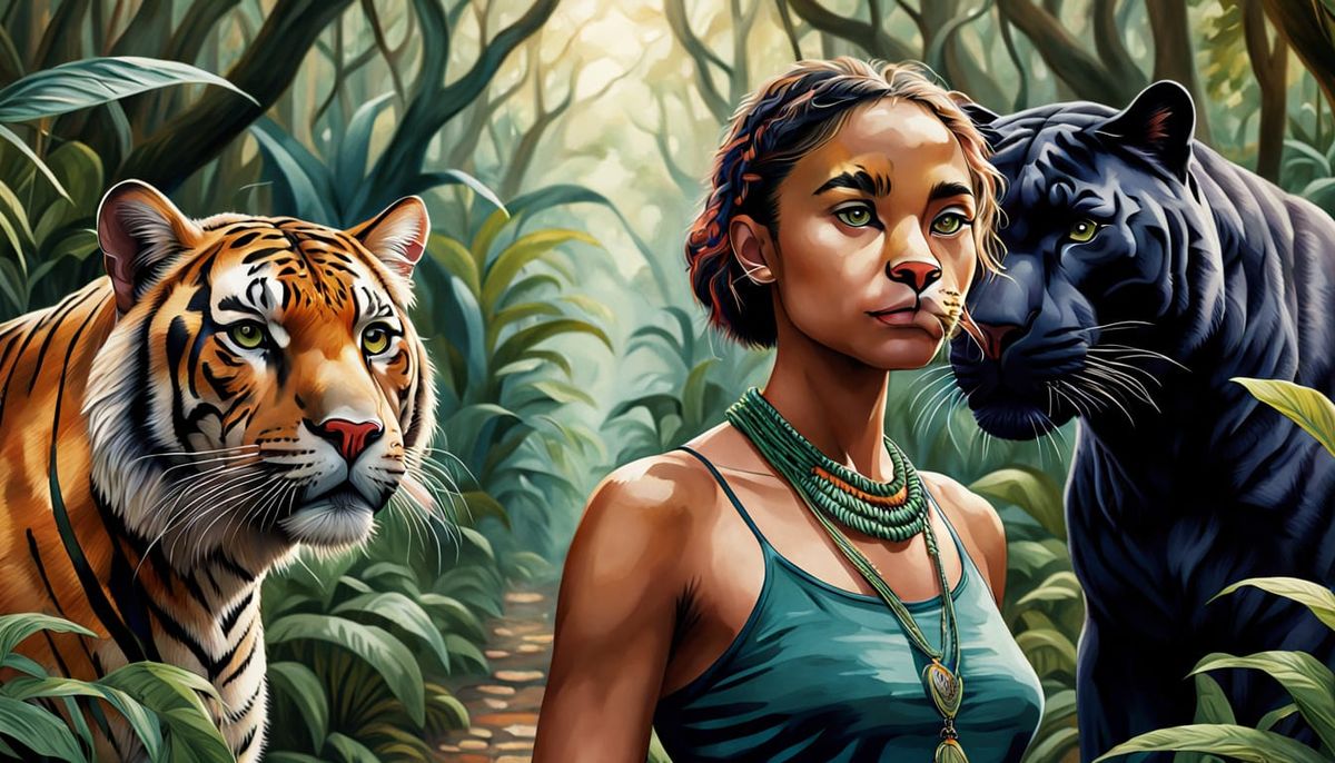 This image shows a tan-skinned woman walking through a jungle path accompanied by a black panther and a Bengal tiger. The watercolor painting features vibrant fauvist expressionism, lush foliage, and warm golden lighting.