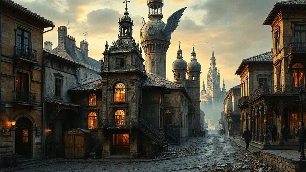 This image showcases a Halloween-themed, decaying European city in a masterpiece oil painting style. It features intricate details, a tea-stained texture, and iridescent copper and rust elements.