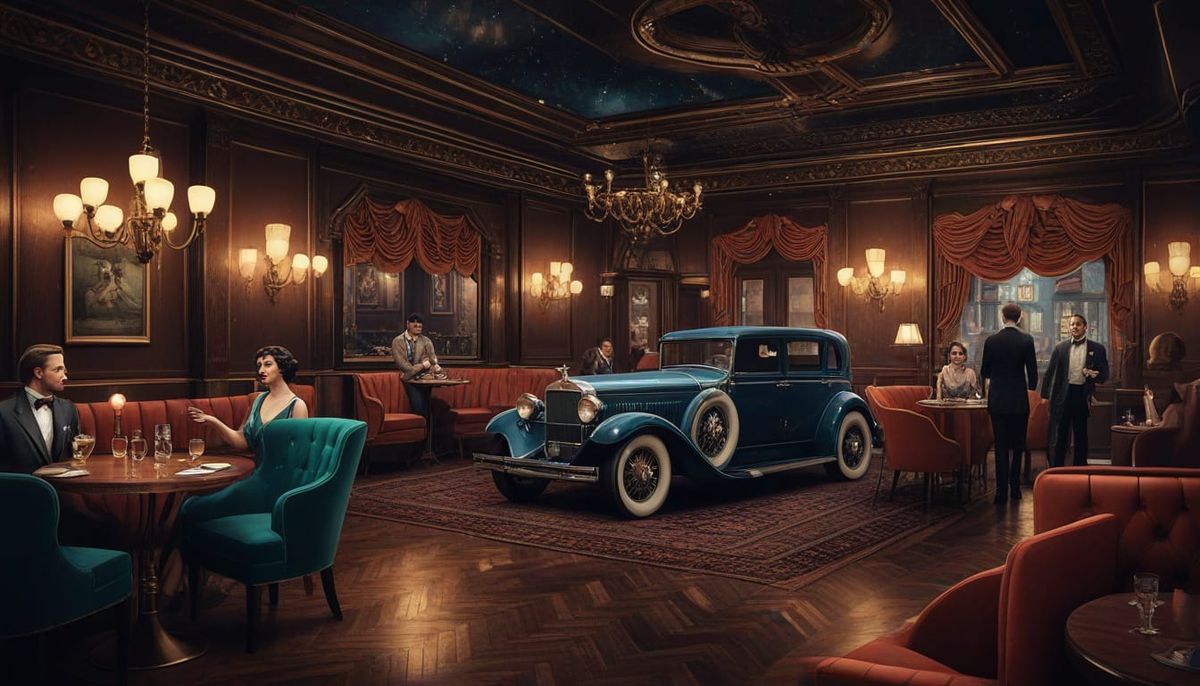 This image shows a vibrant, colorful illustration of a 1920s-themed speakeasy scene. Patrons in flapper dresses and suits enjoy cocktails and jazz in a dimly lit, atmospheric, Art Deco setting.