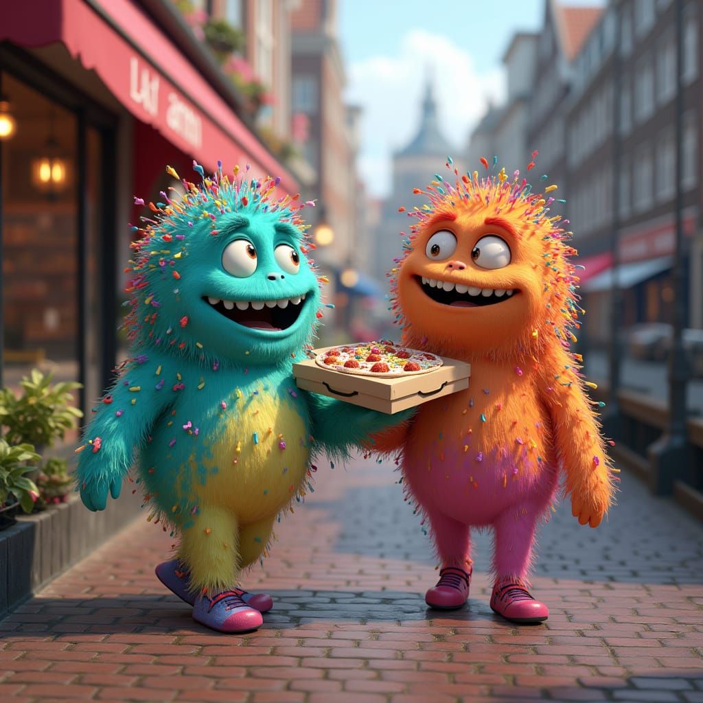 This image shows a teal monster and friends walking along an Amsterdam canal. The group carries pizza and cupcakes, rendered in a detailed matte painting style with vibrant colors and intricate details.