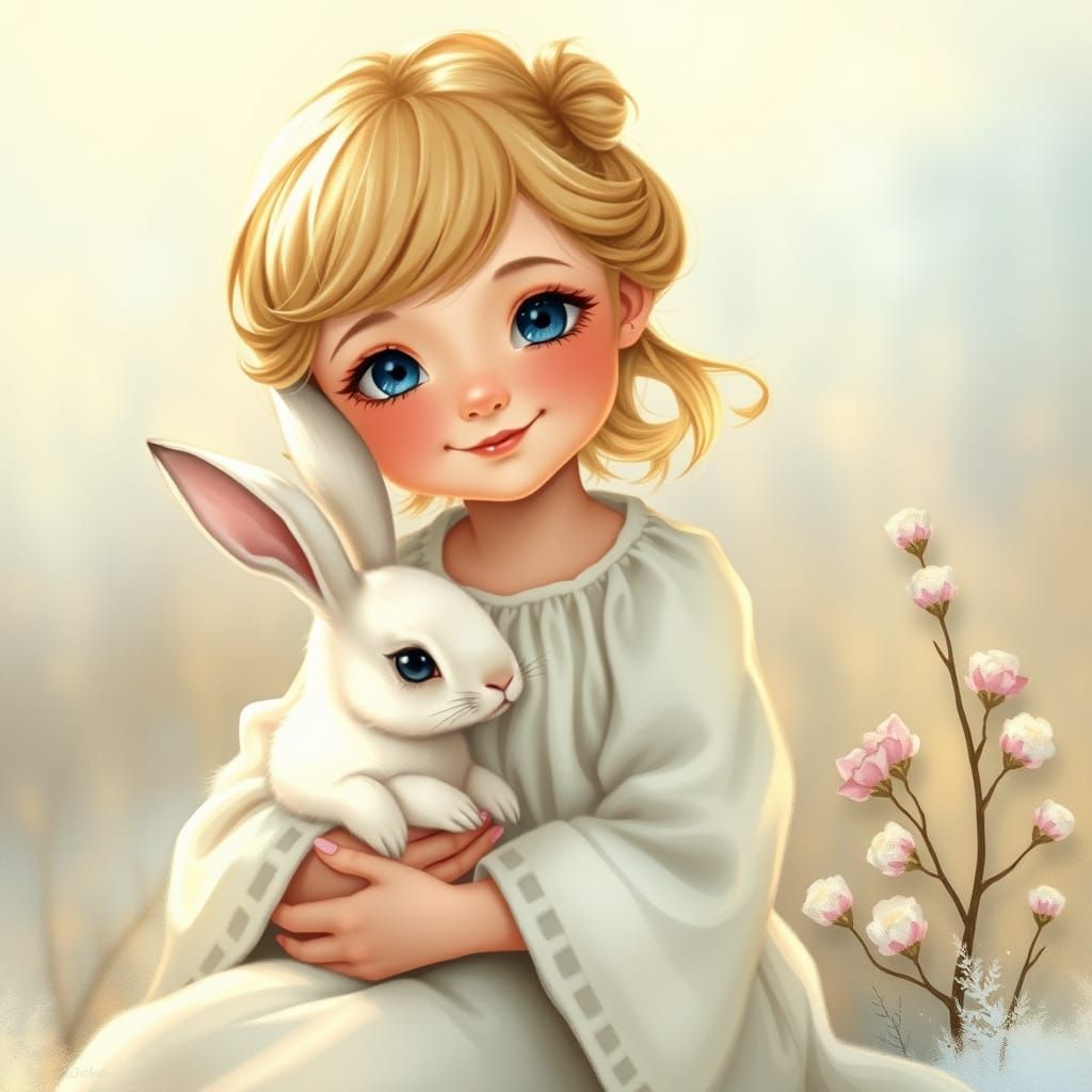 This image depicts a young girl surrounded by a gentle, sunny atmosphere, wearing a light, pastel rainbow dress and holding a white Easter bunny. The scene is reminiscent of classic children's illustrations, with delicate details and soft colors, evoking a sense of wonder and fantasy.