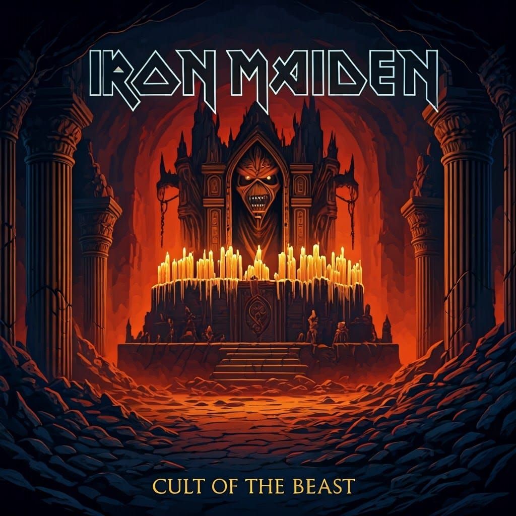This haunting image depicts a dystopian, apocalyptic scene inspired by Iron Maiden's iconic album covers, with a sprawling hell altar and ominous, glowing candles, set against a crumbling, damaged backdrop, evoking a sense of foreboding and chaos.
