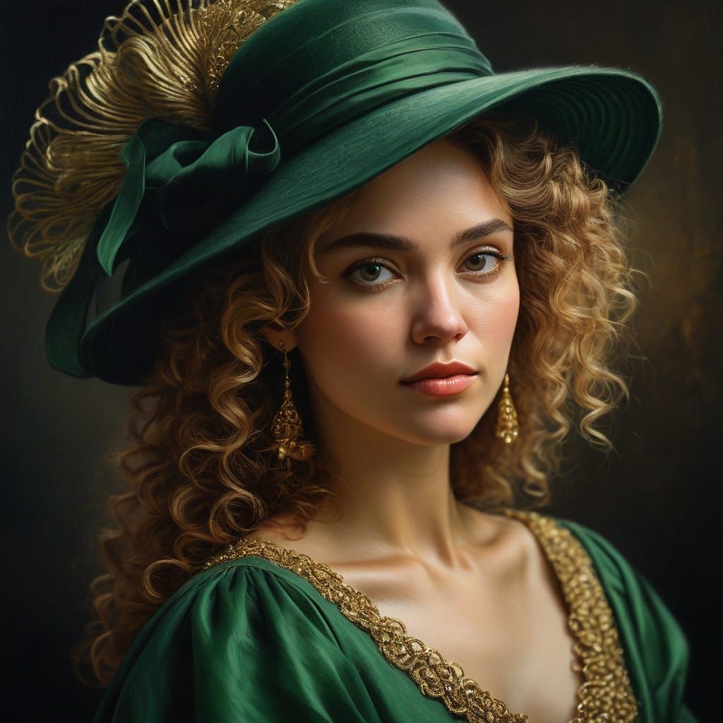 A portrait of a young woman in a green hat and gown. The close-up oil painting style uses soft brushstrokes, delicate golden jewelry, and a dark, subtly gradiented background.