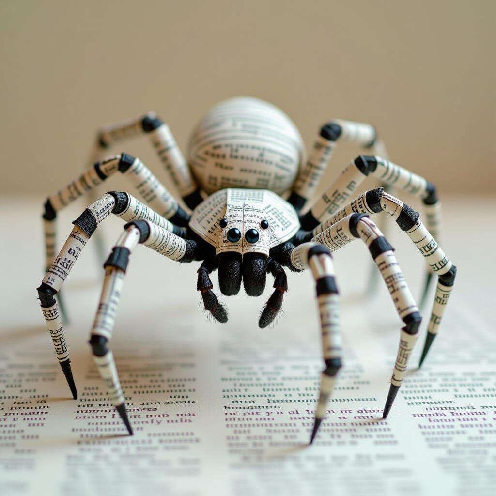 A detailed sculpture of a spider made from woven newspaper. The mixed-media artwork features intricate paper threads and evokes a whimsical and hyper-realistic style, similar to miniature sculptures.