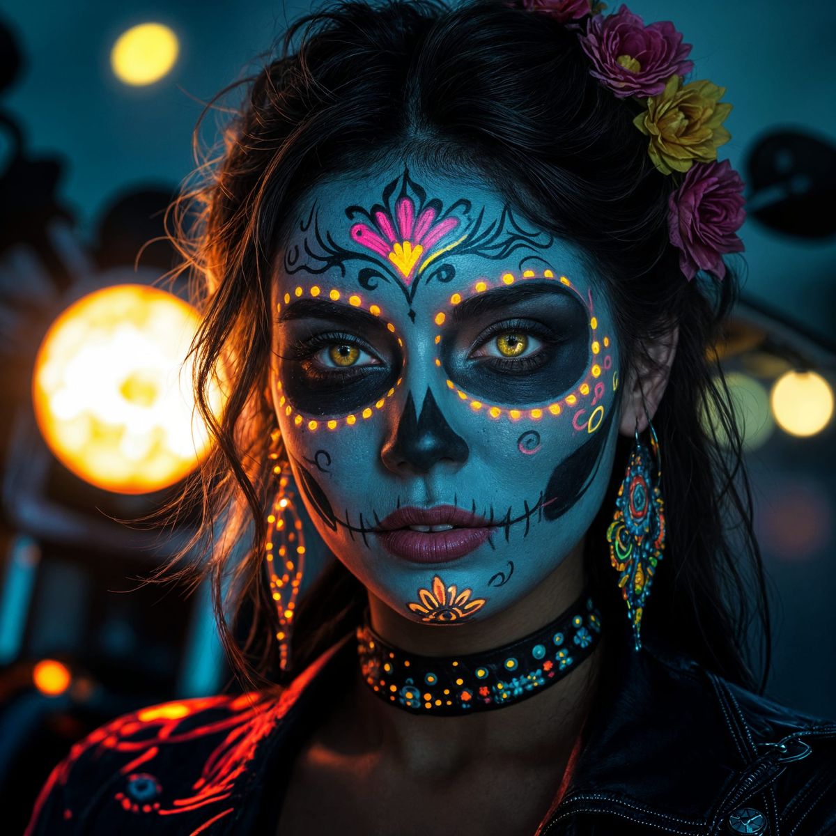 This image shows a woman with vibrant Día de los Muertos face paint that glows under motorcycle headlights. The neon colors create a striking and spooky contrast between light and shadow.