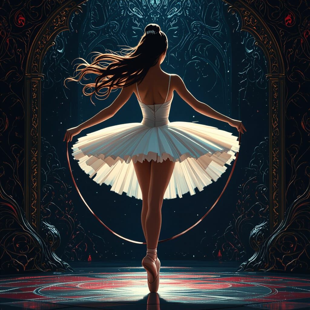 This image shows a ballerina in pointe shoes holding a whip against a dark background. The digital matte painting features intricate details and rich, complementary colors. The aesthetic is reminiscent of fantasy concept art.