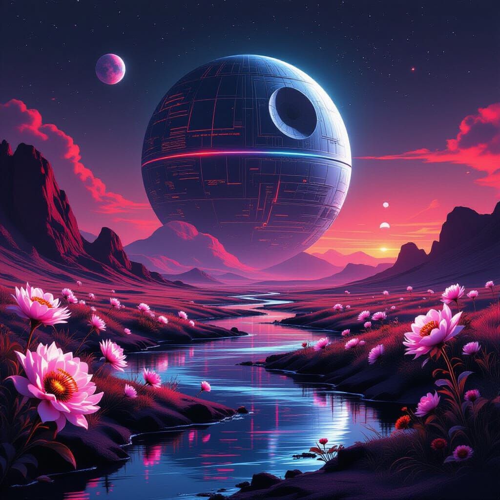 Death Star overlooking ((Shadow world)) "An enchanted giger landscape filled with delicate, translucent rare exotic Passion and Paradise blooms that dissolve into calm river Nile . Fire-Red Neon, palette , creating a serene and otherworldly atmosphere, fluidity, dreamlike transitions, and a vaporwave ...