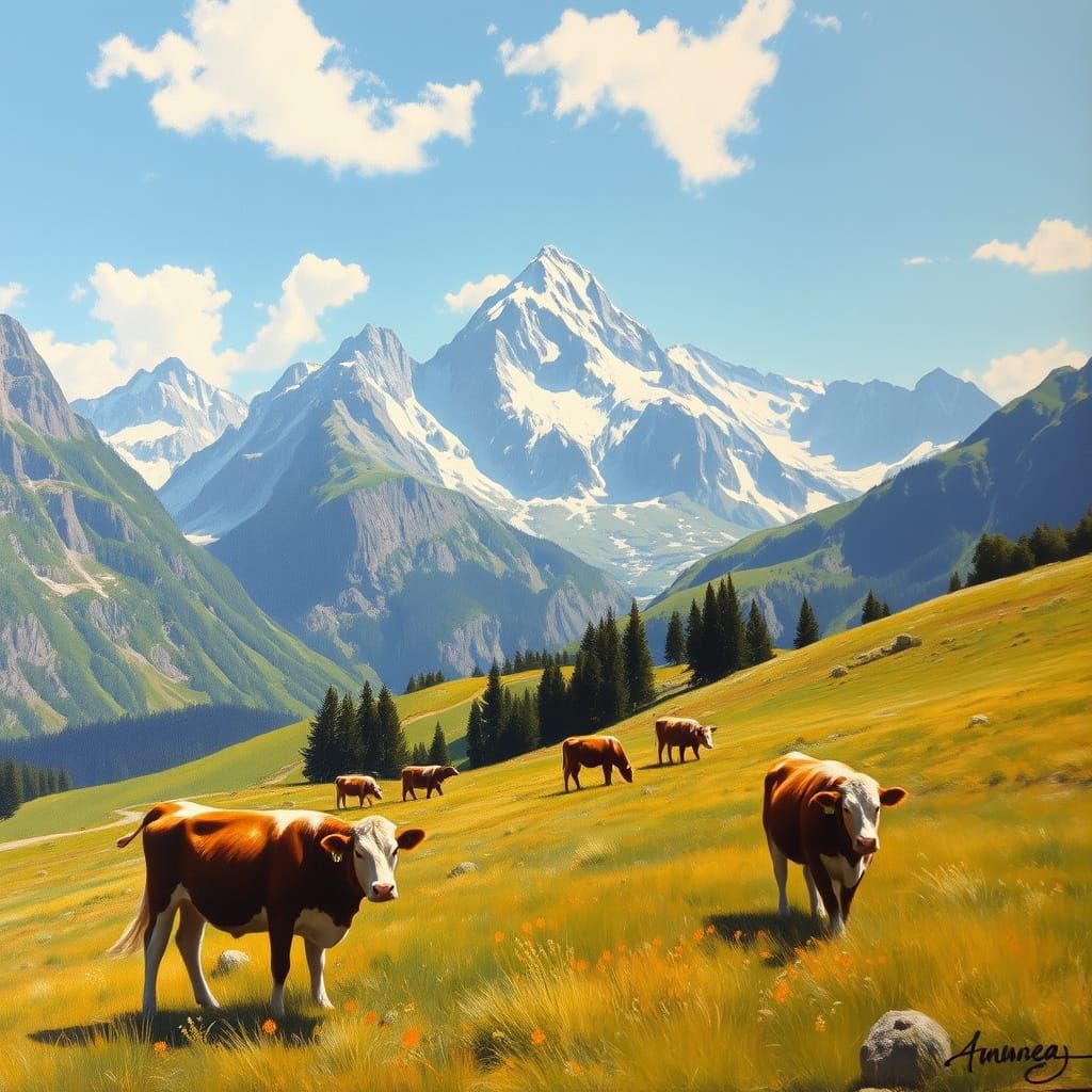 This image is a realistic oil painting of the Swiss Alps on a sunny day. It features alpine meadows, grazing cows, and mountains rendered with visible brushstrokes for texture and depth.
