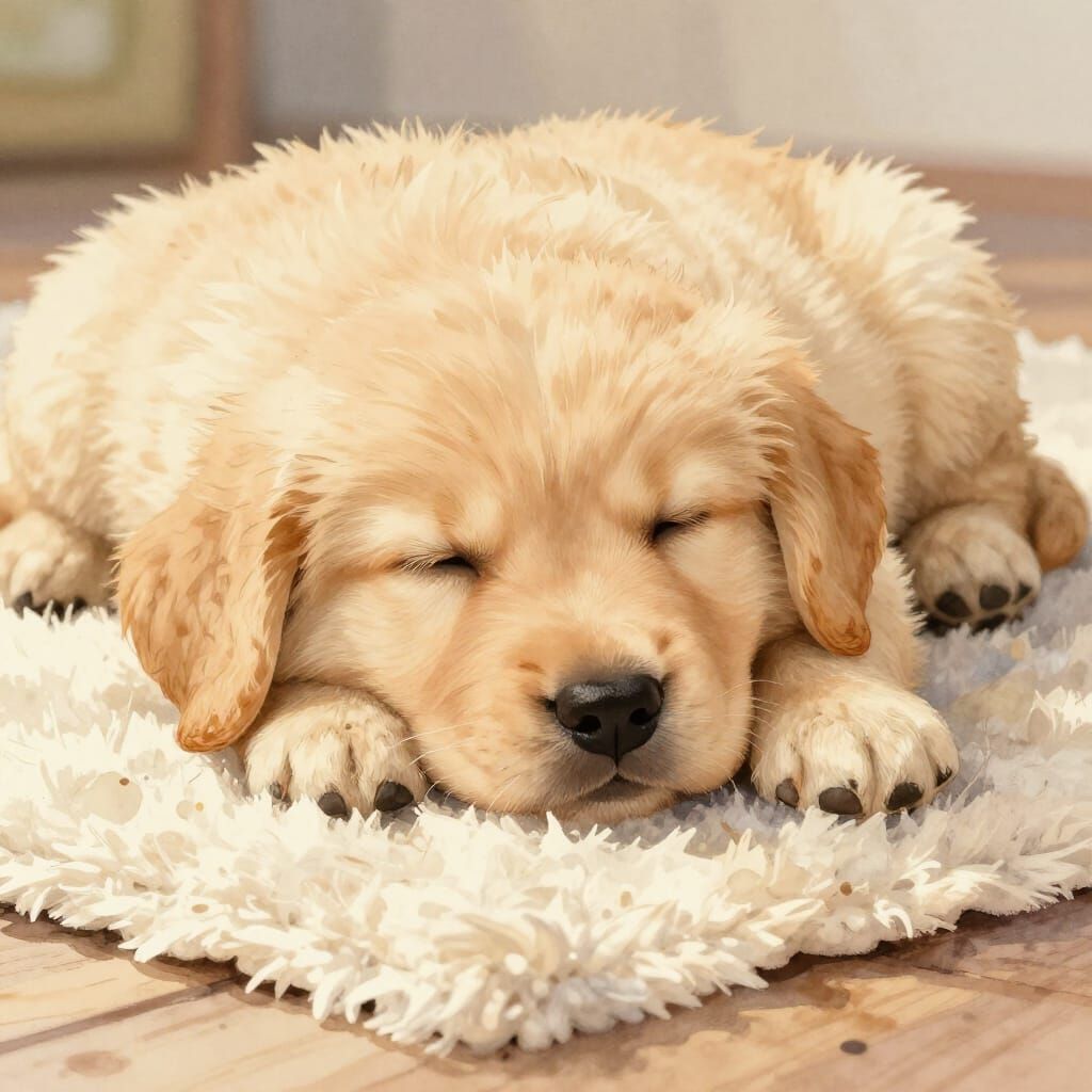This image shows a charming illustration of a sleepy golden retriever puppy resting on a sunlit rug. Features gentle watercolor textures and a pastel color palette, evoking a cozy atmosphere.