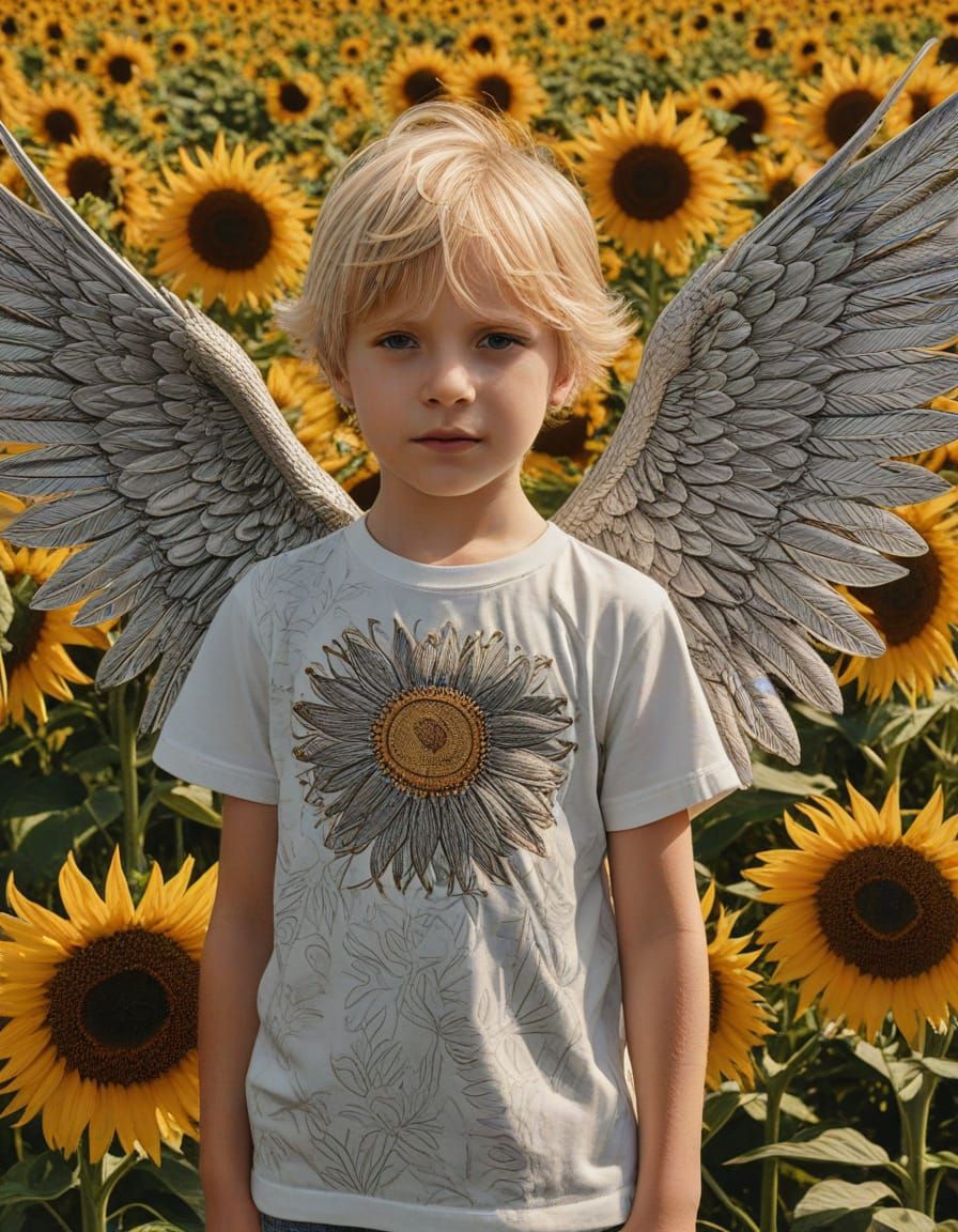 A linocut print of a blond child angel in a sunflower field, radiating innocence. The image features wide, shimmering wings, vibrant petals, and warm sunlight, created in a naive folk art style.