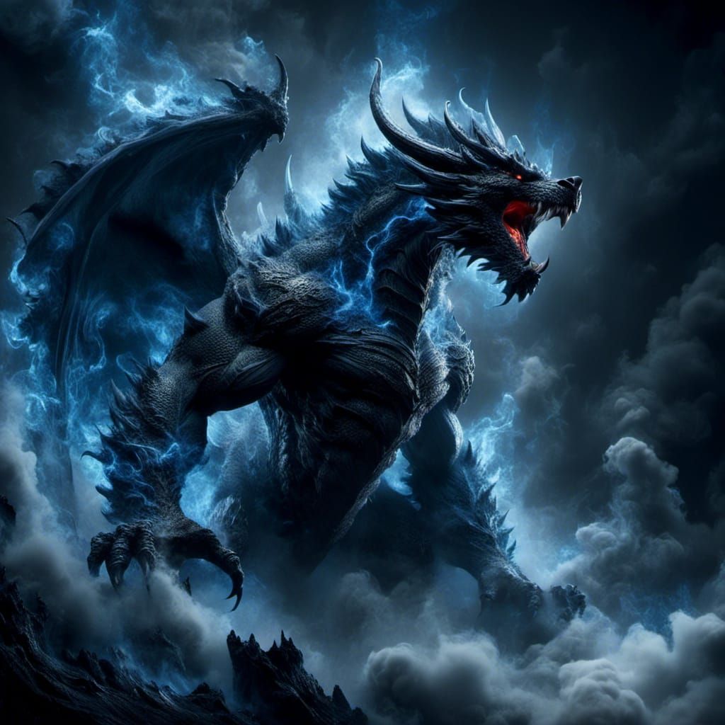 This image shows a formidable dragon-bear creature emerging from darkness. The scene features rising smoke, electric blue clouds, intense mist, and dramatic lighting, rendered with intricate detail.