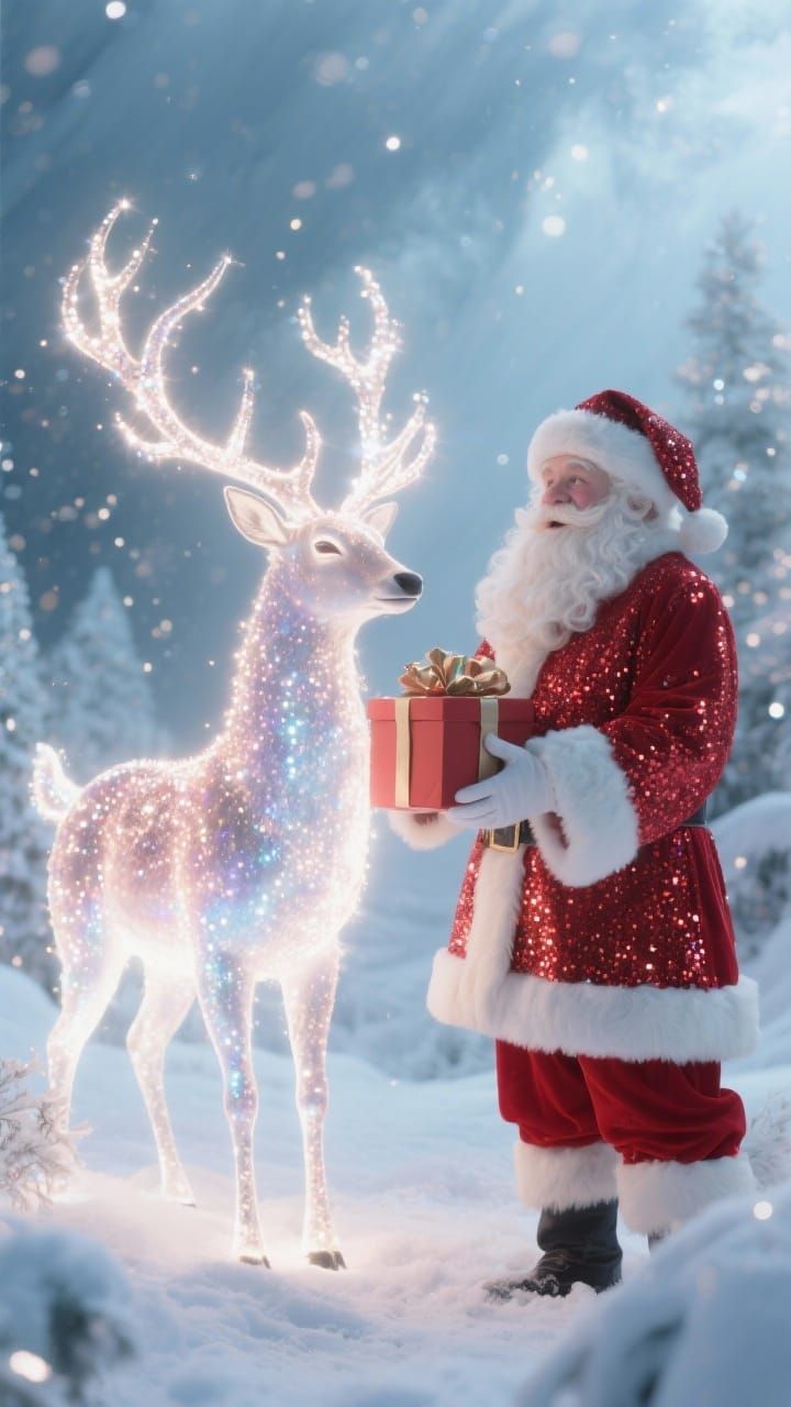 This photorealistic image shows Santa in a sparkling outfit giving a gift to a large deer with glowing antlers. Cinematic lighting creates a magical, festive atmosphere.