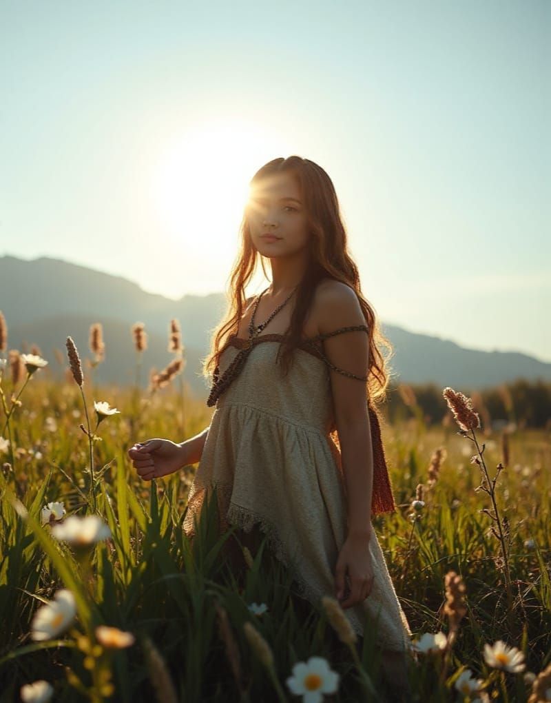 This image shows a serene Neolithic woman surrounded by a vibrant spring meadow, bathed in warm sunlight and tall grasses.