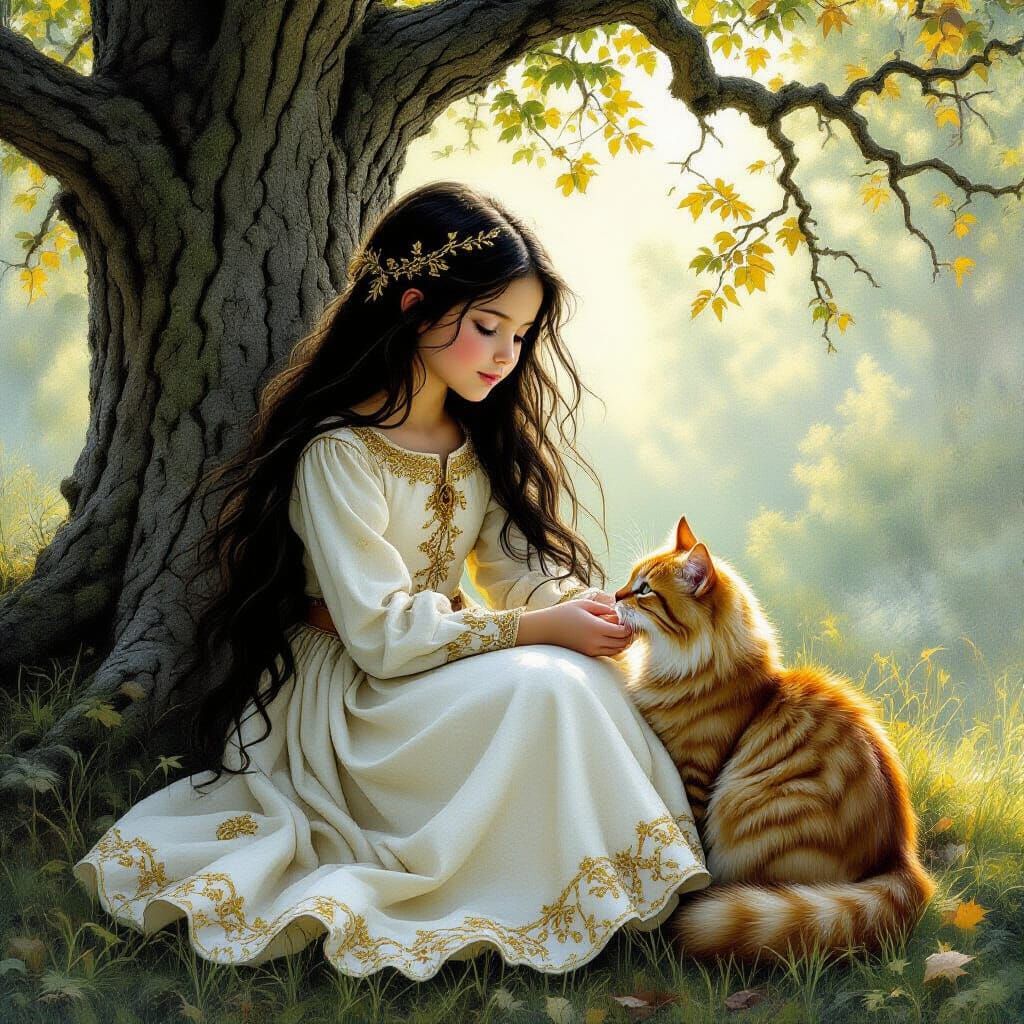 This image shows a young girl in a medieval dress sitting by an ancient oak tree in a sunlit forest clearing. She gently pets a red-haired cat, surrounded by autumn leaves.