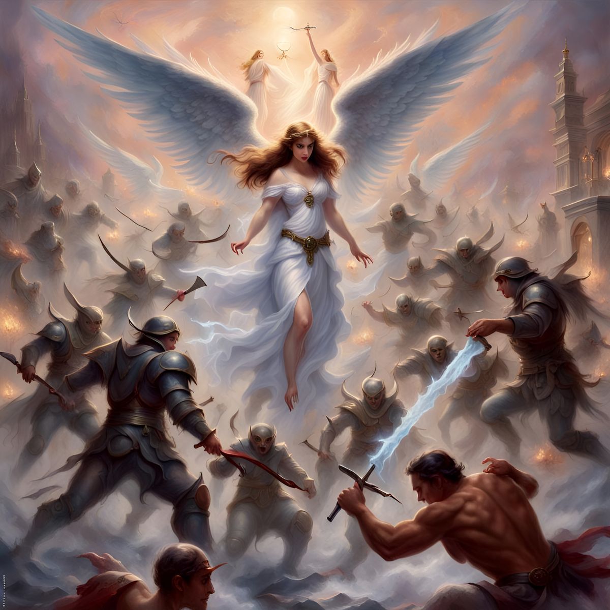 This image depicts a battle between angelic women and demonic forces amidst a misty, hyperdetailed fantasy setting. The scene evokes ethereal qualities.