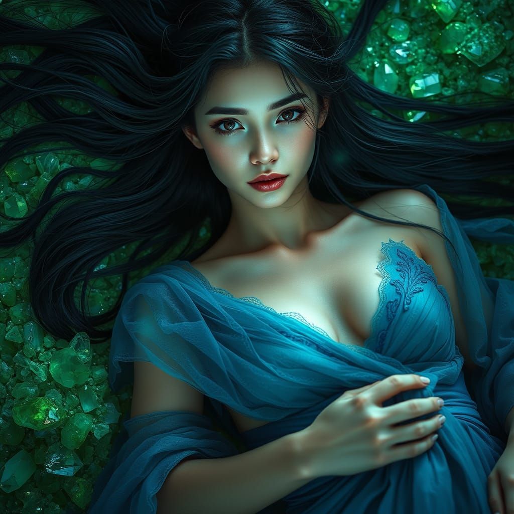 A striking picture of a woman with long black hair on a bed of green crystals. She wears layered blue clothing and her skin glows in a dreamlike scene with swirling particles, in a cinematic digital art style.