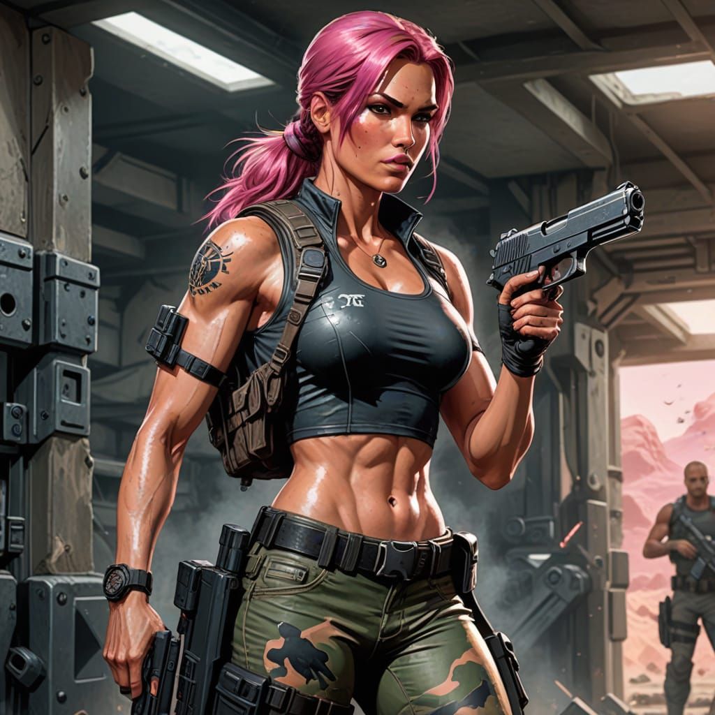 This image shows a woman in military camouflage gear at a firing range, holding a black pistol. The comic book art style features smooth lines, bright light and orange-lens aviator sunglasses.