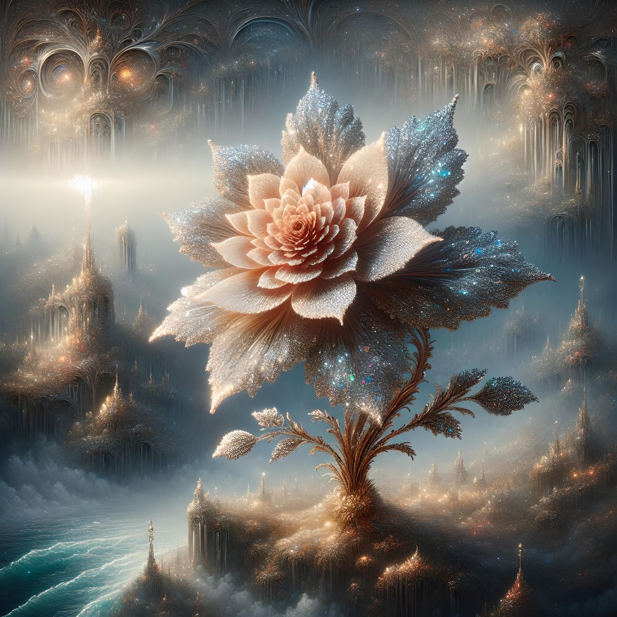 This image shows a glitter flower in full bloom, intensely shimmering and sparkling. The backdrop is a misty, dreamlike fantasy setting reminiscent of pre-1912 romanticism.