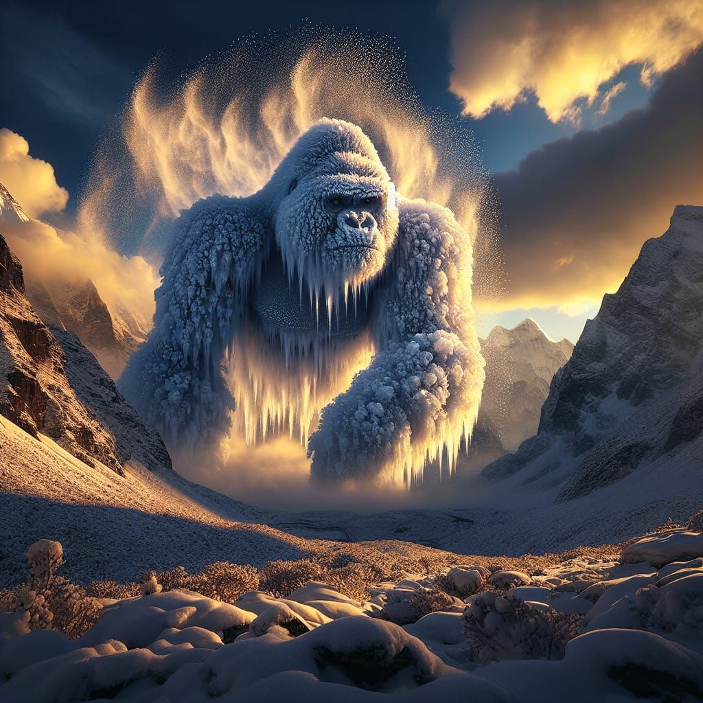 A striking picture of a giant gorilla made of swirling snowflakes in the Himalayas. The image shows the gorilla in motion against a backdrop of twisting clouds and a setting sun.
