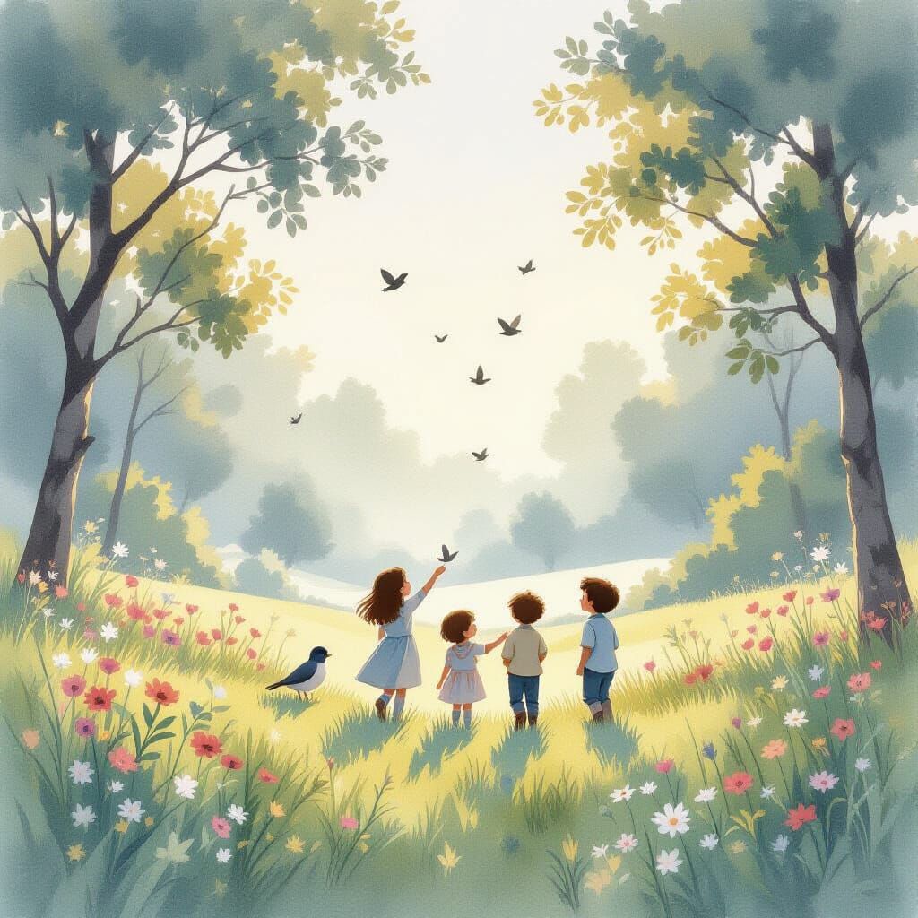 This image captures a serene dawn with soft birdsong, distant children's laughter, and quiet footsteps. Rendered in a delicate, watercolor-inspired aesthetic with muted pastels and diffused light for a tranquil awakening.