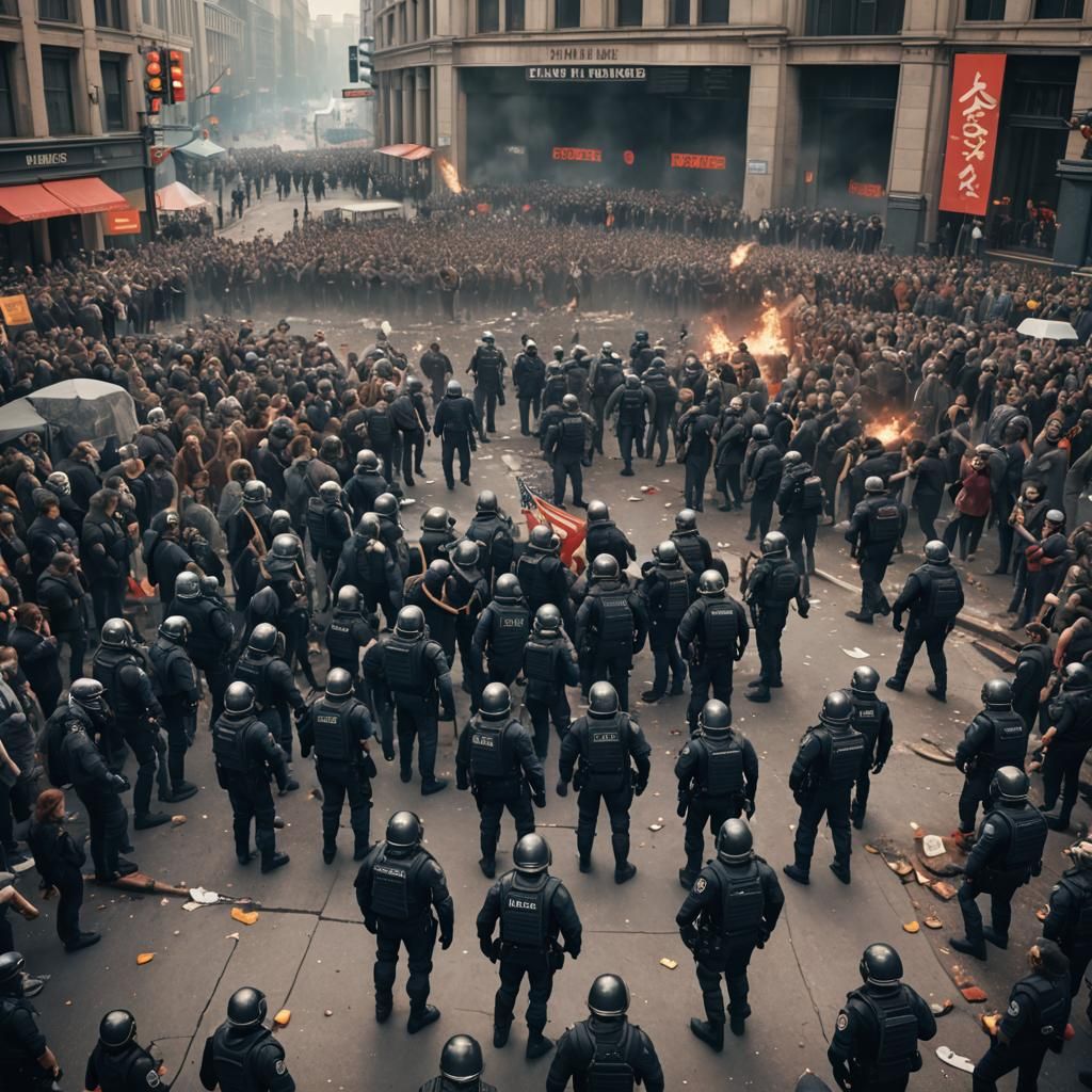 This image shows a tense standoff between riot police and a group of protesters. The scene is rendered with deep colors and intricate details, creating a fantastical, detailed matte painting.