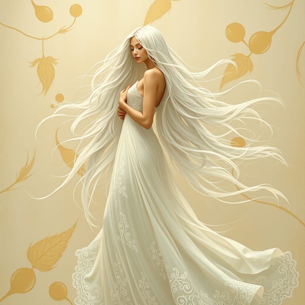 This image depicts a beautiful woman with long, flowing white hair and a delicate, lace-trimmed gown, evoking the softness and elegance of Art Nouveau and fantasy illustrations.