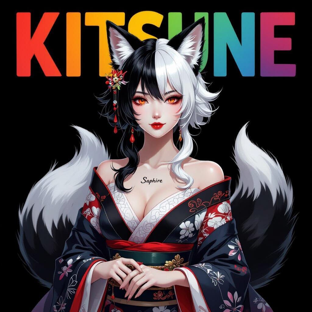 A striking picture of a goddess with fox ears and a vibrant hairstyle against a dark background. The half-body portrait blends hyper-realism and anime elements with a colourful aesthetic.