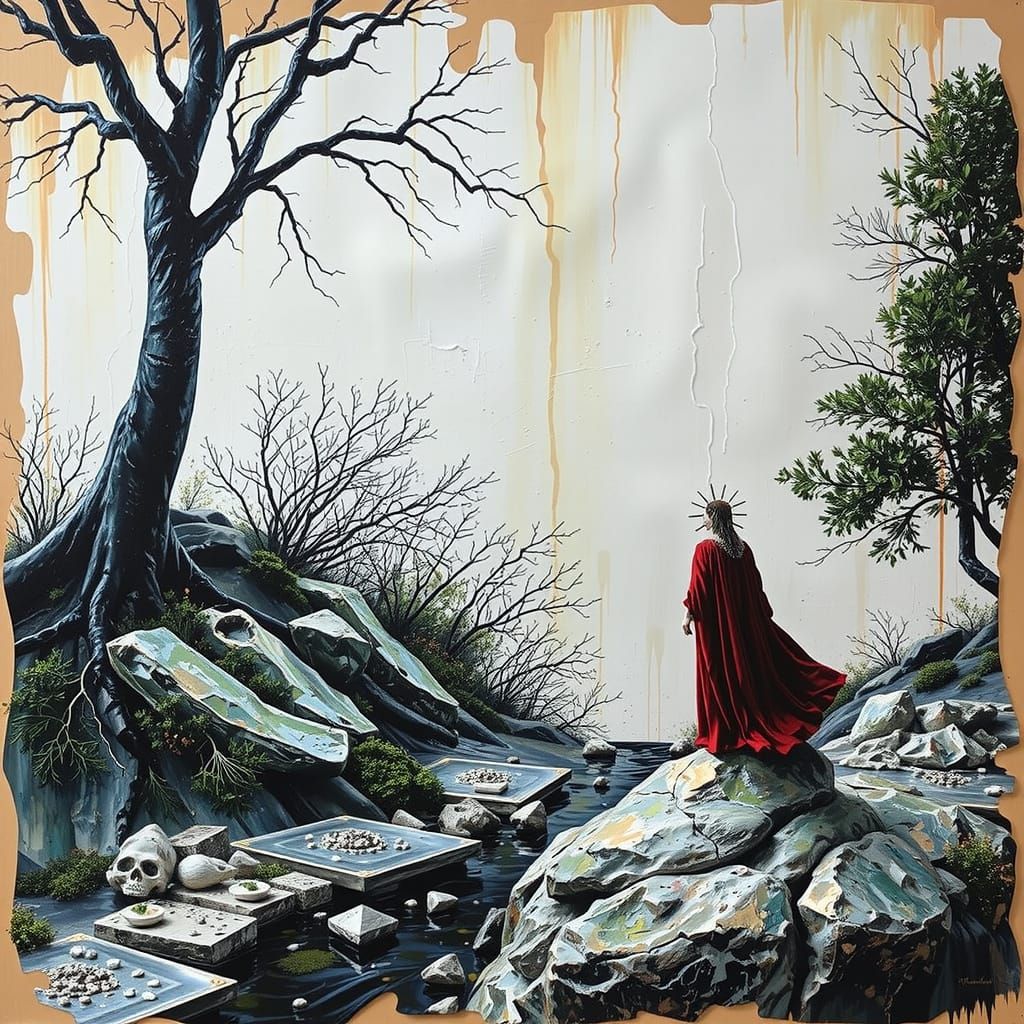 This image showcases a hyperrealistic sculpture bathed in intense, dynamic lighting. Vivid red, green, yellow, black, and white hues create intricate textures and a sense of grandeur.
