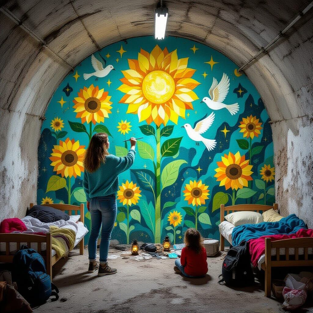 This image shows a woman painting a mural in a crowded underground shelter. The artwork blends intricate illustrative linework with matte colors, incorporating sunflowers and folk patterns.