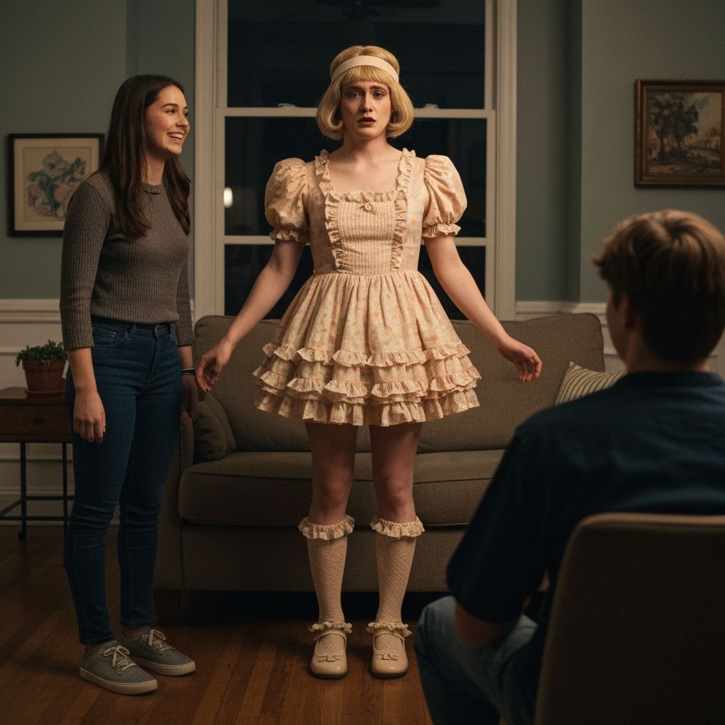 Cinematic film still of a person in a vintage mini-dress, headband, and Mary Jane shoes, with light makeup and short blond hair, courtesying in a living room. Shot with film grain and dramatic lighting.