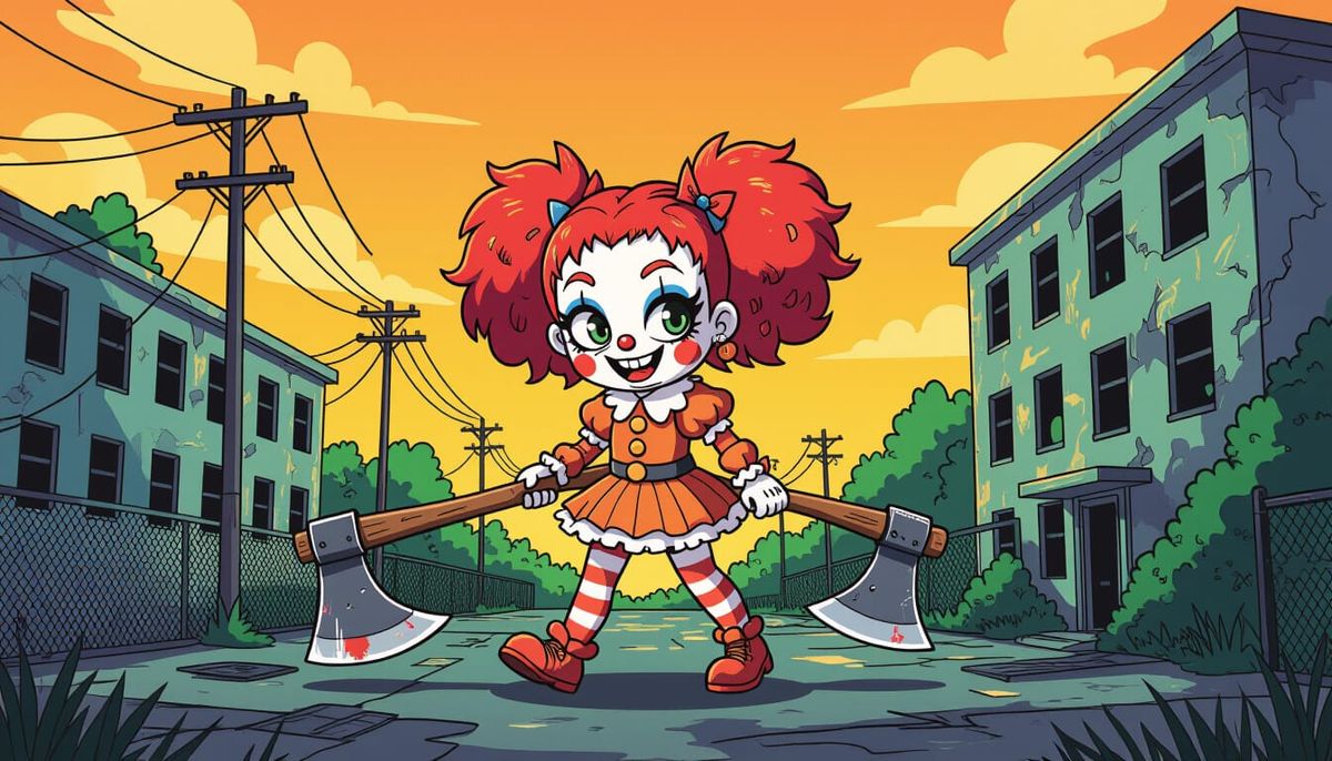 This image depicts a Harajuku-style clown girl dragging an axe through a derelict hospital. The comic art style features vibrant colors, detailed linework, and a playful atmosphere.