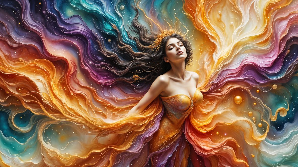 This image showcases a fantasy woman with wings emerging from a windswept scene, set against a backdrop of a colorful sandstorm. The artwork combines photorealistic and abstract elements, utilizing complementary colors and fine details to create a striking visual effect.