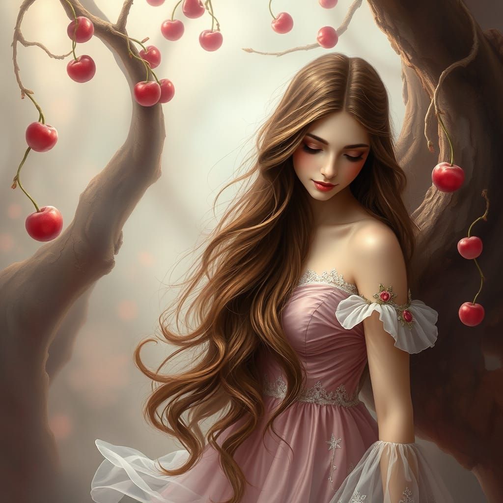 This image features a mystical woman with long brown hair and a shimmering dress, standing in a detailed, dreamy fantasy world with misty tendrils and a sense of wonder. Her gentle smile and languid gaze evoke a soft, enchanting atmosphere reminiscent of digital art and oil painting techniques.