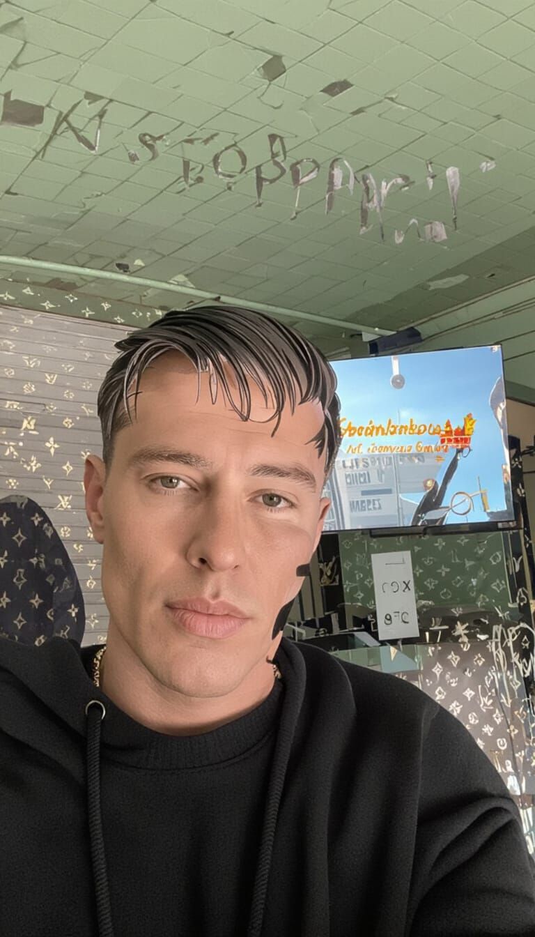 A striking street photography portrait of a man in a detailed Balenciaga hoodie, face partially hidden by the hood. Features a graffiti wall and LV monograms. High fashion style.