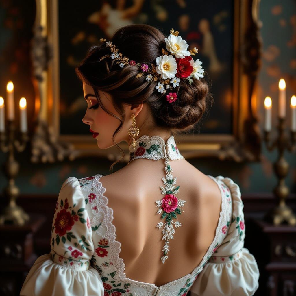 This image shows a woman with porcelain skin, viewed in profile, adorned with damask patterns and flowers in her hair. The scene, reminiscent of Baroque paintings, is set in a candle-lit chamber with Renaissance art.
