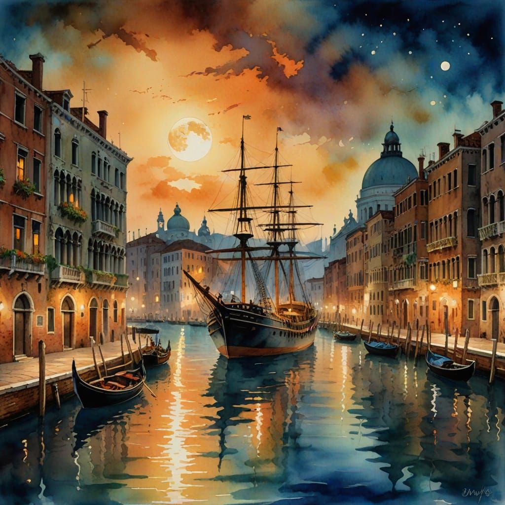 This watercolor painting captures a giant ship navigating a Venice cityscape beneath a harvest moon. Vibrant, saturated colors and textured brushstrokes create a dreamlike, evocative atmosphere.