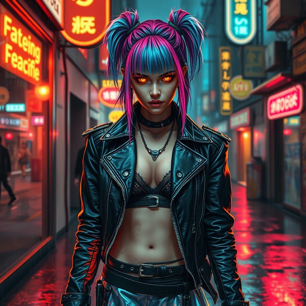 A cyberpunk princess stands defiantly in a gritty alleyway, surrounded by neon signs and the hum of hovercars, with glowing hair and cybernetic enhancements, captured in a cinematic cyberpunk style.