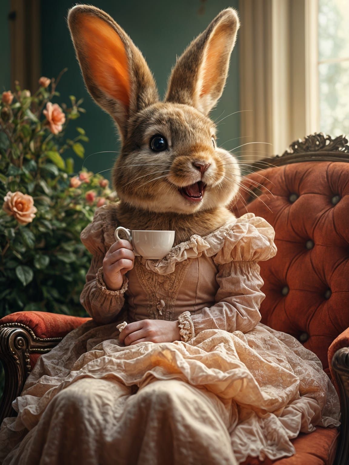 A whimsical image shows a beautiful, laughing anthropomorphic bunny rabbit in Victorian attire. She is seated on a chaise lounge, enjoying tea with mirth and happy tears in a magical realism style.