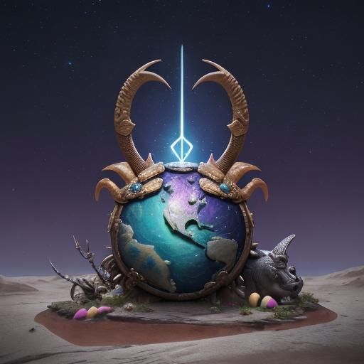 A striking close-up of an ibex with an Aztec geode shell, accompanied by a tortoise. The scene includes Easter eggs, a starry sky, and a mammoth, rendered with vibrant neon colors and ultra-detailed textures as detailed matte painting.