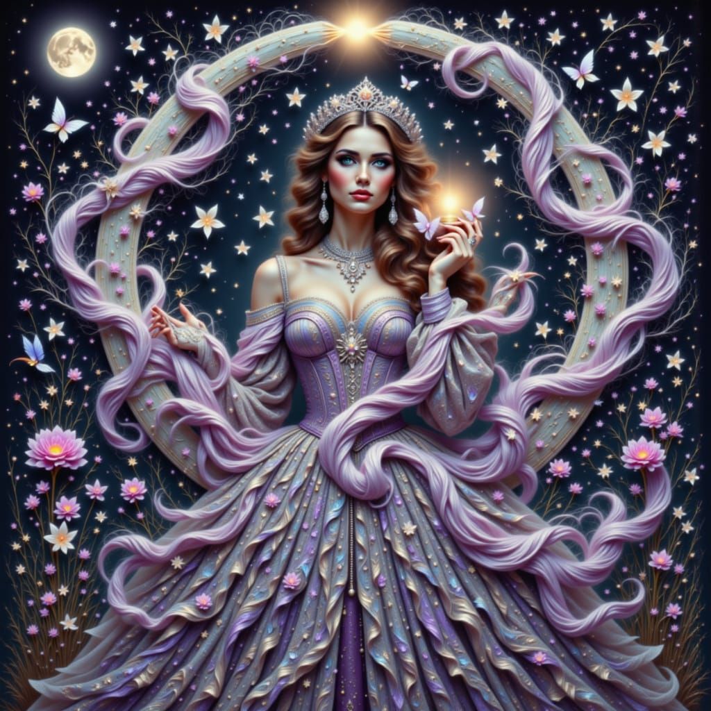 This image depicts Eudoxia Lopukhina, a 17th-century Russian tsarina, in a richly decorated lilac costume with intricate braids and a silver kokoshnik. The art style blends Art Nouveau and Russian Gothic with surreal elements, rendered with sharp, volumetric light.