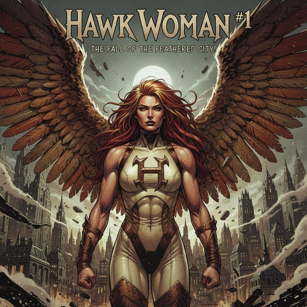 This comic book cover features Hawk Woman, a superhero with feather hair and mighty wings, overlooking a city from a skyscraper. Rendered in a vibrant fantasy art style with bold linework and dramatic lighting.