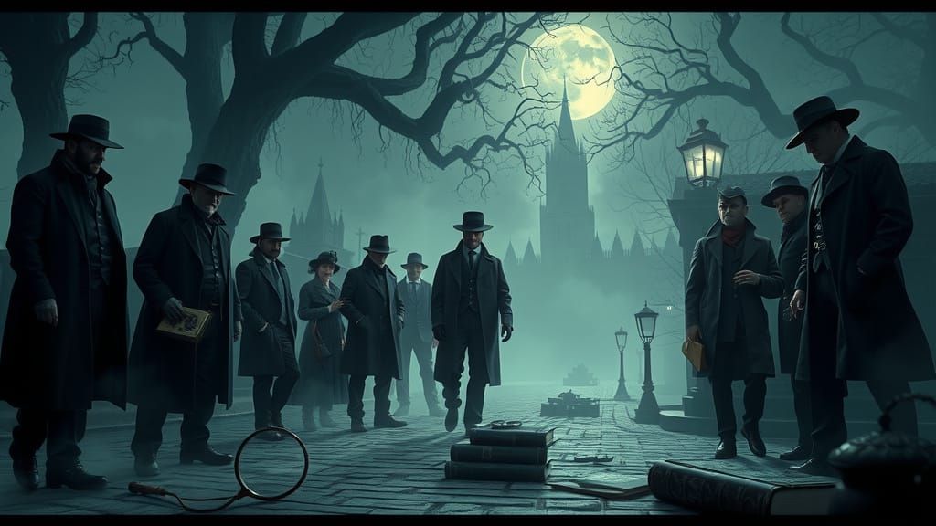 This image depicts a group of detectives and coroners in Victorian attire gathered around a crime scene, surrounded by mist and ancient trees, with investigation items scattered about, creating a tense and foreboding atmosphere reminiscent of a 19th-century London mystery, with a rich color palette and i...