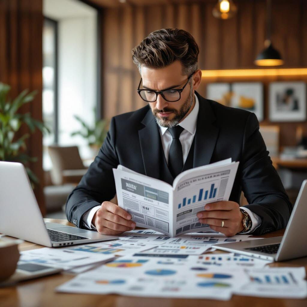 A housing society treasurer researches investments in a modern office. This image features a blend of meticulous futuristic design, vibrant colors, and detailed textures.