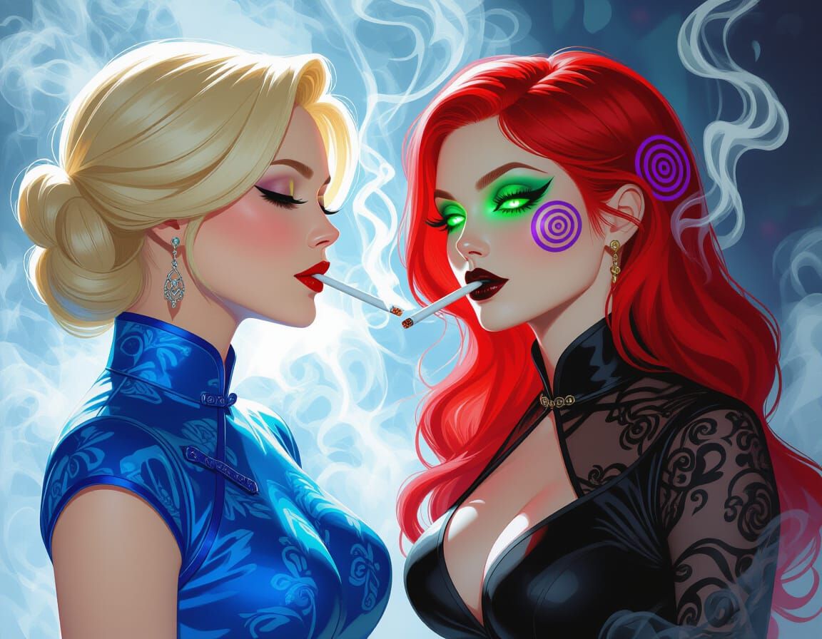 This image shows two women in a smoky, cinematic scene. One woman with red hair and striking green eyes is the focus, set in a dark cyberpunk aesthetic with dynamic lighting.