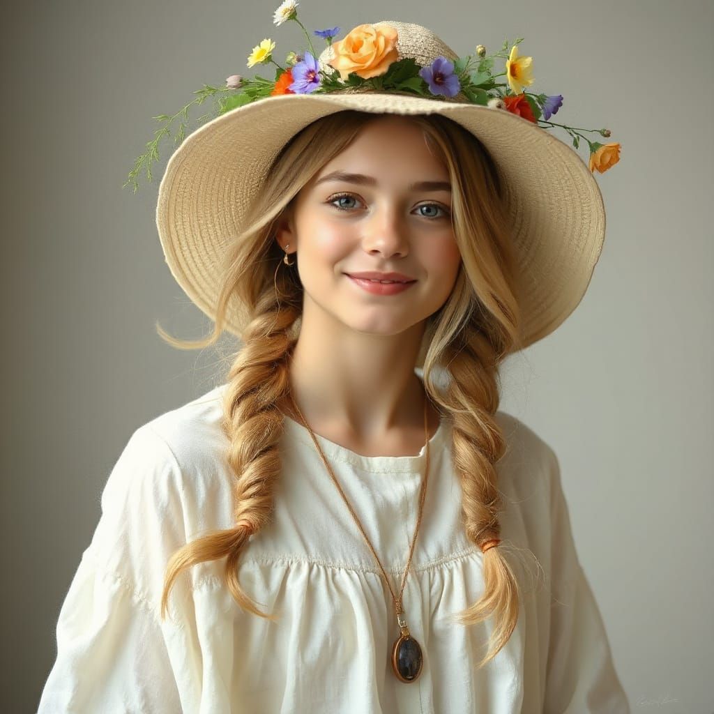 A serene young woman with braided blonde hair smiles, wearing a white linen dress and sun hat adorned with wildflowers. The image is rendered in an impressionistic style with soft, diffused lighting.