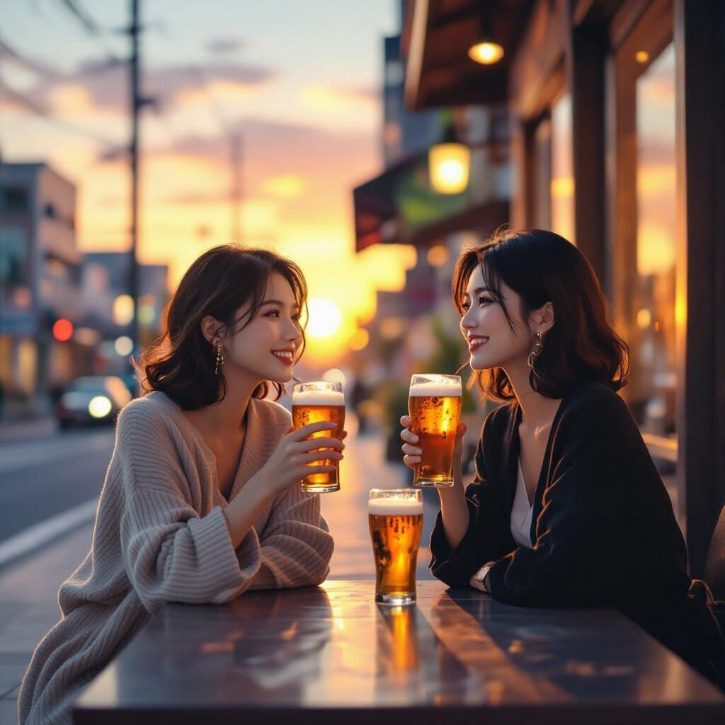 Generate your own images of Japanese ladies drinking beer at sunset. Free and easy AI image creation.