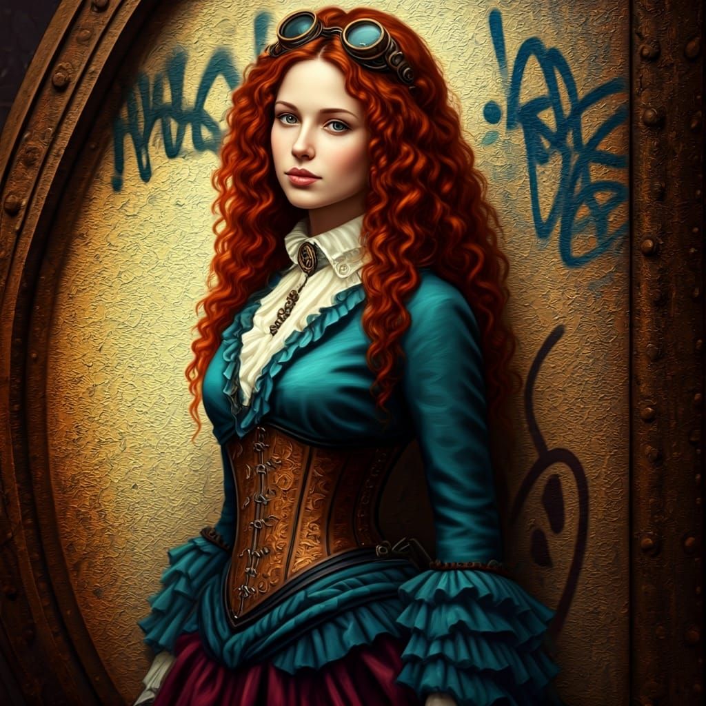 This image shows a beautiful steampunk girl with long, curly red hair and brown eyes, wearing a ruffled teal and burgundy dress. She stands in a steampunk subway against a graffitied wall, in an Edwardian-influenced style.