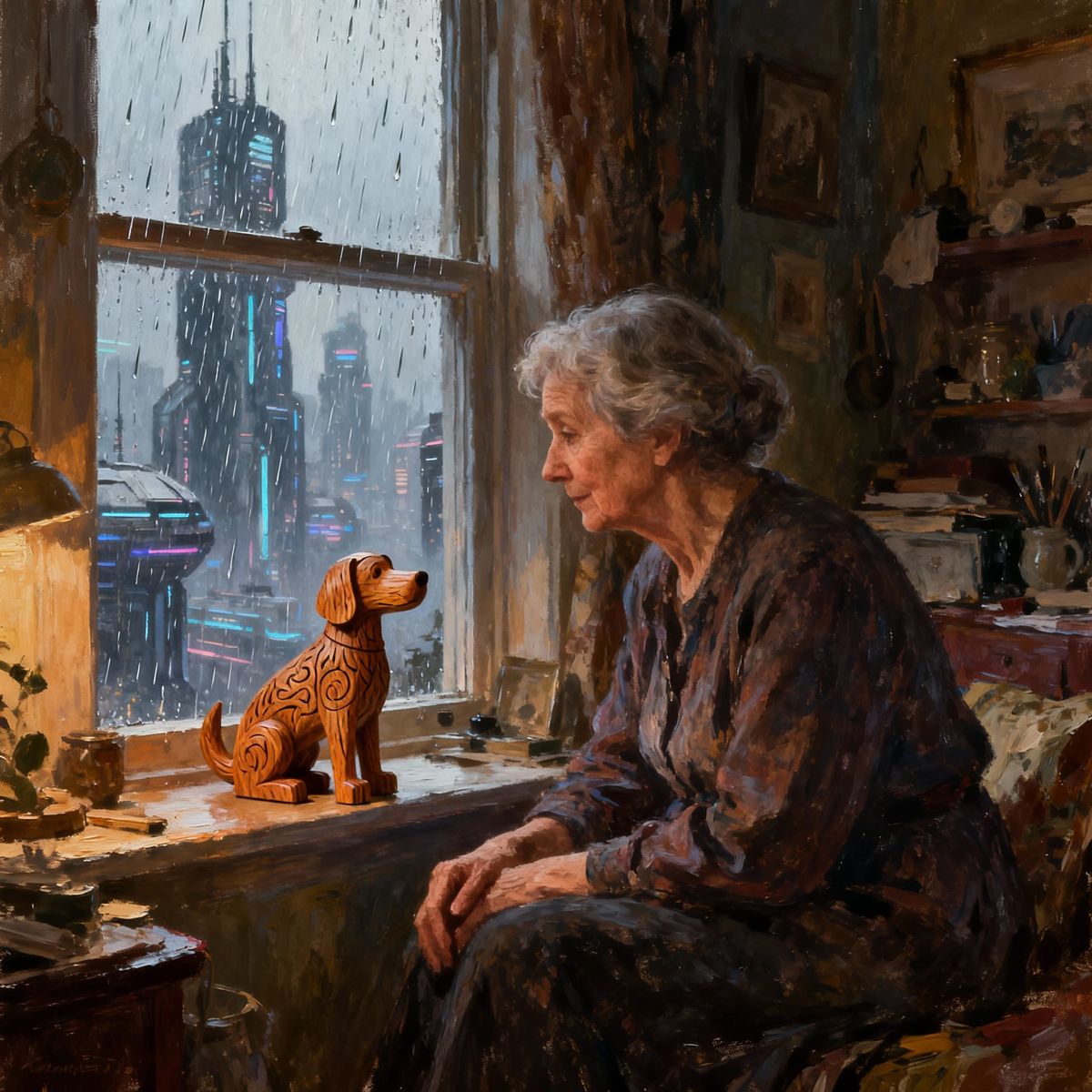 This impressionistic oil painting shows an elderly woman in a warm, cluttered room gazing at a wooden dog. A futuristic city appears through the rain-streaked window, evoking a bittersweet, nostalgic mood.