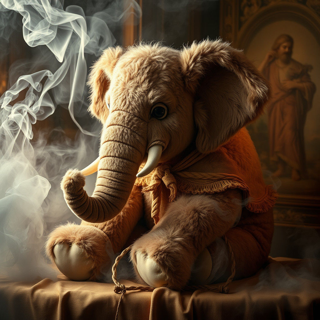A captivating image of a plush elephant surrounded by heavenly smoke. The artwork showcases baroque still-life elegance and folk-art mysticism, with soft, golden light enhancing its serene wisdom. Hints of a forgotten mystical world are visible.