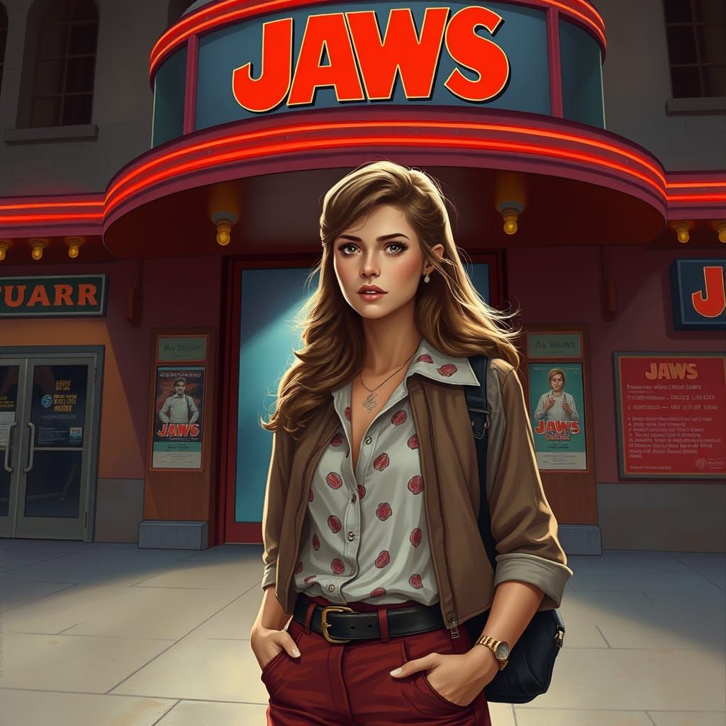 This image shows a woman in a 1970s outfit in front of a movie theater displaying a Jaws poster. The scene has a retro-futuristic aesthetic.
